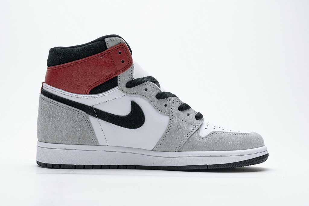 Las Air Jordan 1 Retro High OG "Smoke Grey" lucen un toque de Varsity Red en la solapa del tobillo, estampado con el clásico logotipo Jordan Wings en el lateral. El resto de la parte superior está acabada en tonos estrictamente neutros, resaltados por una base de piel blanca con superposiciones de ante gris. El Swoosh negro de Nike se complementa con detalles negros a juego en el cuello y la suela de goma. El logotipo de Nike en la lengüeta de nailon blanco completa la estética original.