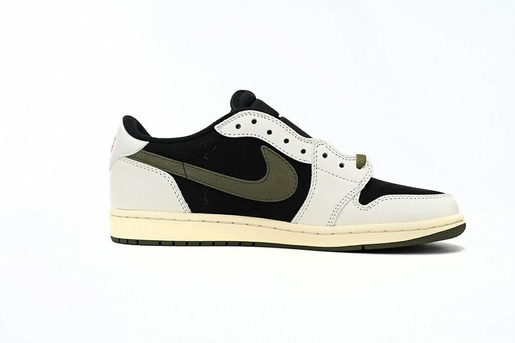 Las Travis Scott x Women's Air Jordan 1 Retro Low OG SP 'Olive' presentan la primera colaboración de zapatillas en tamaño femenino del rapero que encabeza las listas de éxitos. La parte superior combina una base de ante negro con superposiciones de cuero blanco roto y Swooshes de ante verde oliva, con un diseño de cuadros invertidos en el lateral y un diseño tradicional en el lado opuesto. Los tonos tierra neutros están salpicados de atrevidos detalles carmesí, resaltados por las etiquetas Nike Air tejidas en la lengüeta y la marca Jordan y Cactus Jack en cada lengüeta del talón. La suela de goma de la parte inferior de la zapatilla combina los laterales en blanco roto vintage con una suela de goma verde oliva.