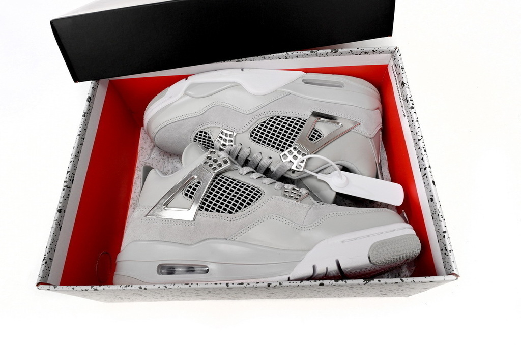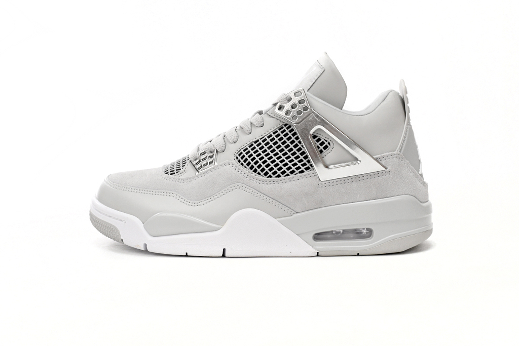 Las Air Jordan 4 Retro para mujer "Frozen Moments" presentan una parte superior de ante gris pálido con una capa de piel brillante en el antepié a juego. La malla transpirable se utiliza en el cuello y en el cuarto panel, mientras que los ojales moldeados y las aletas de sujeción de la zapatilla brillan en un acabado plateado metálico. La lengüeta y la lengüeta moldeada del talón están adornadas con la marca Jumpman. La entresuela de espuma gris y la amortiguación Air-sole visible en el talón sujetan la zapatilla.