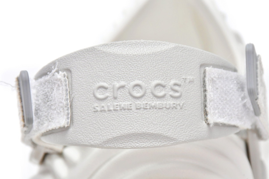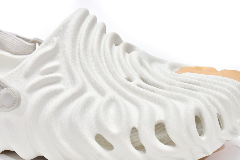 El zueco Salehe Bembury x Crocs Pollex 'Stratus' reúne al célebre diseñador de calzado con la marca de calzado informal con sede en Colorado. El diseño de Bembury, el primer zueco de tacón cerrado de Crocs, se presenta en un tono marfil prístino con una serie de crestas cóncavas en la parte superior y la suela de espuma moldeada. Se puede llevar de dos maneras: 'Trail', con la correa pivotante en el talón para las aventuras al aire libre, o sin la correa para el uso 'Fee'.
