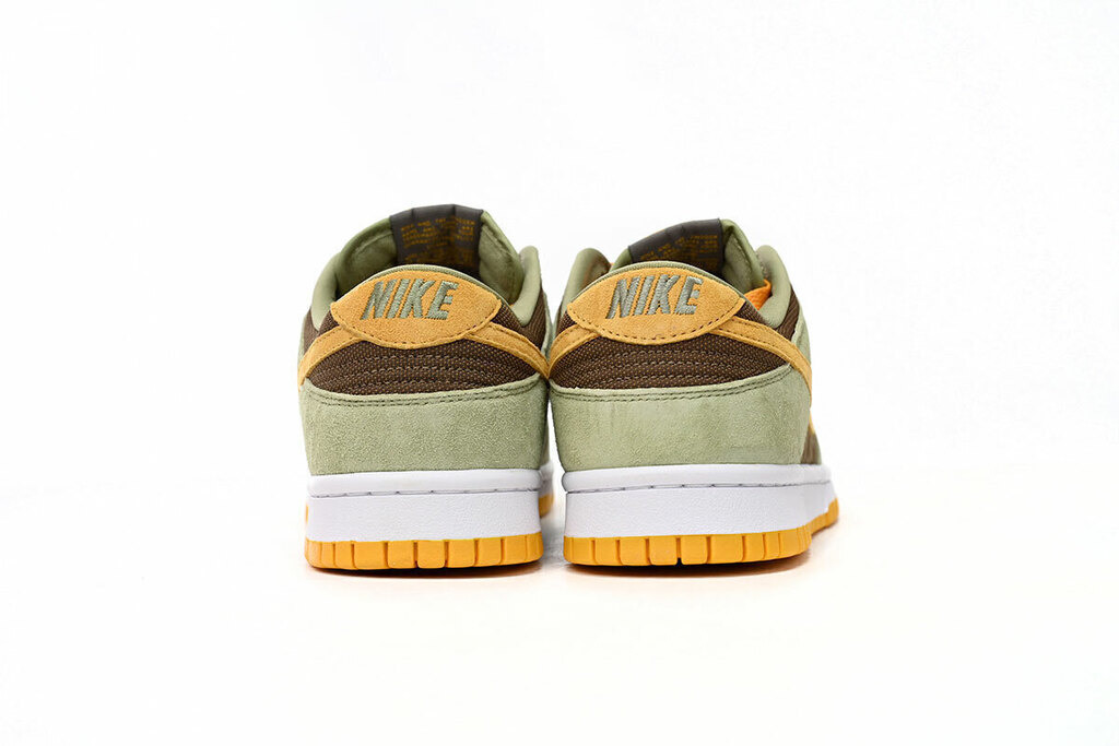 Las Nike Dunk Low "Dusty Olive", confeccionadas con un ante mantecoso acabado en tonos contrastados, podrían confundirse con el cuarto miembro perdido del pack "Ugly Duckling" de Nike de 2001. La parte superior combina una base de color marrón rústico con superposiciones de color verde pálido y toques de color naranja brillante en el Swoosh, la lengüeta del talón y los cordones. Una etiqueta Nike tejida decora la lengüeta ligeramente acolchada, con la misma construcción de nailon marrón utilizada en el cuello. La entresuela de goma blanca contrasta con la estructura multicolor y da paso a una suela exterior que aporta un toque final de color.