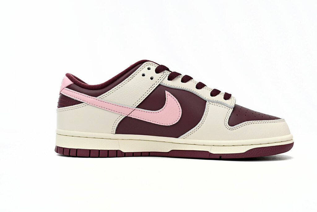 Las Nike Dunk Low Premium 'Valentine's Day' actualizan la zapatilla de baloncesto tradicional con una combinación de colores distintiva inspirada en el 14 de febrero. La parte superior de la zapatilla es totalmente de piel y presenta una base de color burdeos intenso con superposiciones de color hueso en el antepié y el talón. Detalles en rosa suave en el Swoosh, la etiqueta Nike tejida en la lengüeta y la lengüeta del talón. La base de la zapatilla baja es una suela de goma duradera que combina paredes laterales vintage en blanco roto con una suela exterior de goma granate.