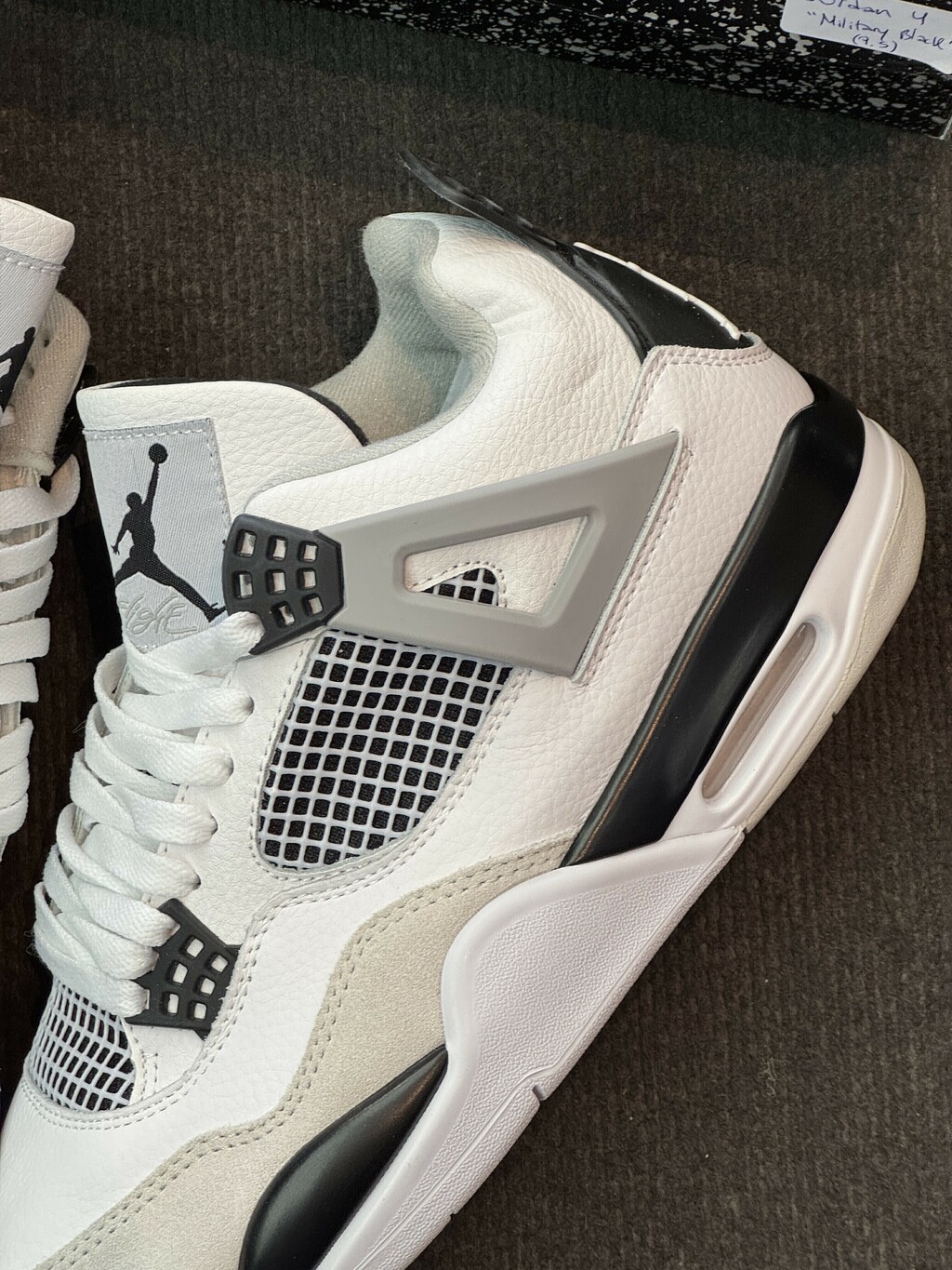 Las Air Jordan 4 Retro "Military Black" presentan los mismos colores y materiales que las OG "Military Blue" de 1989. La parte superior es de cuero blanco liso, reforzado con una capa de ante gris en el antepié. Los ojales de TPU, la lengüeta moldeada del talón y el logotipo Jumpman en la etiqueta tejida de la lengüeta presentan detalles contrastados en negro. La amortiguación ligera es cortesía de una entresuela de poliuretano bicolor, realzada con una unidad Air-sole visible bajo el talón.