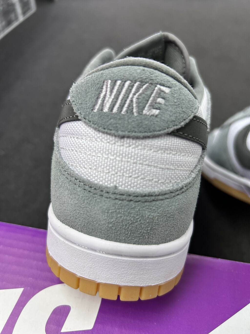 Las Nike Dunk Low 'Smoke Grey Gum' llevan hilos reflectantes entretejidos en los cordones, que sujetan una parte superior de piel blanca con superposiciones de ante gris en el antepié y el talón. Un Swoosh reflectante de piel gris recorre el panel lateral. Otros elementos de marca incluyen una etiqueta Nike tejida en la lengüeta y una marca Nike bordada en la lengüeta trasera. La zapatilla descansa sobre una entresuela blanca y se apoya en una suela de goma adherente.